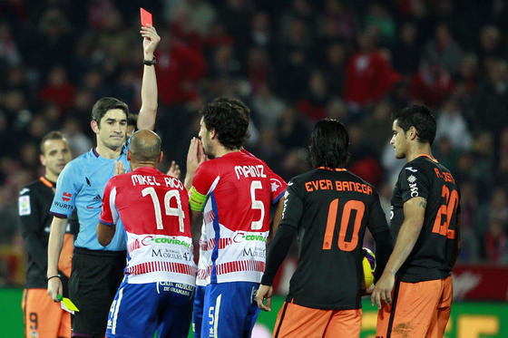 El Valencia mantenía la paciencia e intentaba realizar combinaciones de pases para superar a la defensa de un equipo andaluz que, con las líneas muy juntas, se mostraba sólido atrás y buscaba salir con velocidad al contragolpe cada vez que se le presentaba la ocasión. El choque superaba la primera media hora de juego y lo hacía con malas noticias para los nazaríes, que se quedaban con uno menos por la expulsión de Mikel Rico, que recibía la segunda tarjeta amarilla tras una inexistente mano que solo vío el colegiado navarro y que suponía su segunda tarjeta amarilla del partido y correspondiente expulsión. El conjunto ‘ché’ aprovechaba la superioridad numérica para empujar cada vez más a los locales hacia su área y sumaba más futbolistas al ataque. Lo que obligaba a que Brahimi, Torje y Dani Benítez retrasaran su posición para que los suyos no acusaran en exceso la baja de Mikel. El ritmo del encuentro había decrecido de forma notable y los primeros cuarenta y cinco minutos llegaban a su conclusión con el empate a cero inicial en el electrónico.