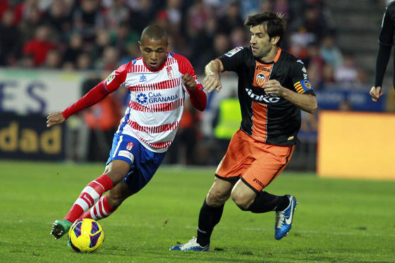 El partido comenzaba con ambos conjuntos bien situados sobre el terreno de juego y con las ideas claras sobre lo que debían hacer para llevarse los tres puntos. El Granada CF presionaba muy arriba con la intención de recuperar el balón cerca del área visitante y sorprender a la defensa rival, mientras que el Valencia intentaba hacerse con la posesión de cuero para buscar a un Soldado que ejercía como principal referencia para los de Valverde. Ningún equipo conseguía imponerse en el centro del campo y aunque los valencianos lo intentaban, era el Granada el que llegaba con más claridad al área contraria. De hecho, estuvieron a punto de adelantarse en el electrónico tras una jugada entre Brahimi y Mikel Rico que acabó con un centro del futbolista vasco que Diego Alves consiguió despejar a duras penas. Posteriormente sería Ighalo el que no llegó por poco a culminar un buen centro de Nyom.