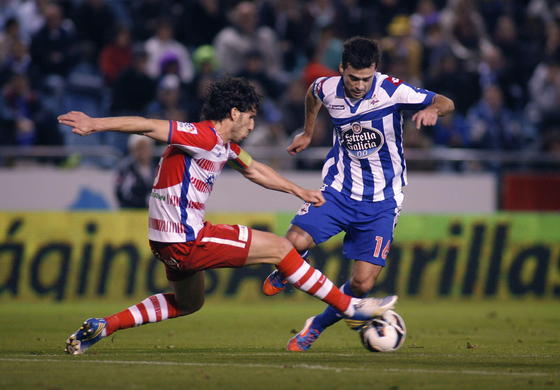El Granada CF iba de menos a más en el choque y adelantaba metros ante un Dépor que no daba su brazo a torcer y encontraba a un Pizzi muy móvil como su efectivo más peligroso. Las igualdad era máxima y el cronómetro sobrepasaba la primera media hora de juego. Los dos bandos bregaban con intensidad en el centro del campo y esperaban un error del rival para intentar dar el primer golpe de la noche pero esto no sucedía. Las llegadas se sucedían con cuenta gotas pero en los últimos cinco minutos de la primera mitad llegó la revolución. Primero la tuvo Riki para los coruñeses con una doble ocasión muy clara desde dentro del área pero su primer disparo lo taponó Mainz y el segundo se marchó desviado. A continuación, era el turno del Granada: Nyom hacía gala de su potencia con una llegada desde la derecha que finalizaba con un centro de Aranda al área que Nolito cabeceaba a la madera con la fortuna de que cuando el balón se marchaba hacia fuera golpeaba en Marchena para acabar introduciéndose en la portería, dando ventaja al Granada CF en la última jugada de los primeros cuarenta y cinco minutos (0-1).