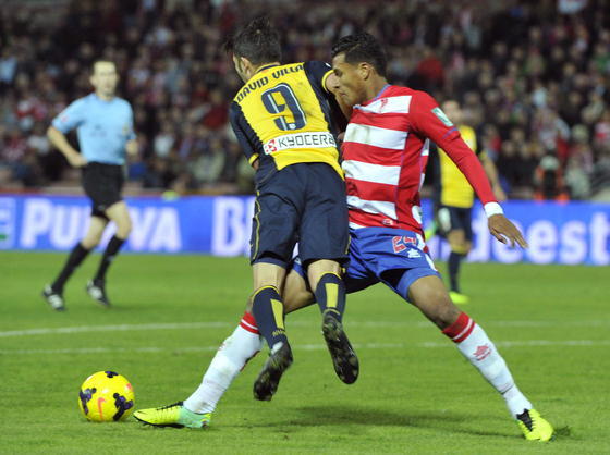 El futurible jugador de la Selección la tenía constantemente tanto con Recio como con Murillo pero la zaga local conseguía mantenerlo a raya, hasta que en el minuto 36 un derribo infantil de Mainz a Villa dentro del área nazarí fue señalado por González González como penalti. El hispano-brasileño fue el encargado de transformar la pena máxima, deshaciendo así el empate en la tabla de goleadores con Cristiano Ronaldo. Por si fuera poco, Adrián tuvo en sus botas el segundo, después de recibir solo en el área, aunque su definición se marchó fuera muy cerca del poste derecho de Roberto.