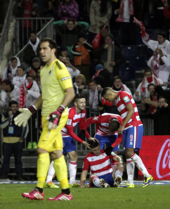 Tras la reanudación, enésima lesión de Yebda. Recio tuvo que cubrir el hueco. Fue justo antes de que Roberto desbaratara con un alarde de reflejos una gran jugada visitante. Agirretxe había rematado a quemarropa. En la siguiente acción fue Brahimi el que puso a prueba a Bravo, que respondió a mano cambiada. El partido volvió otra vez a una dinámica eléctrica, con el balón de un lado para otro. El Granada, eso sí, echado más para adelante. El Arabi no supo poner la guinda a un pase de la muerte de Foulquier. El marroquí, inoportunado por un defensor vasco, remató desviado. Pero el cuadro de Alcaraz jugaba con fuego. La Real Sociedad no necesitaba mucho para plantarse en el campo rojiblanco. Griezmann, además, aparecía por todos lados para poner en evidencia a la zaga local. Así llegó el tercero de los de Arrasate. Ataque vasco, apertura a Carlos Vela, Foulquier que no aprieta y el mejicano que suelta un zambombazo que se cuela por toda la escuadra.